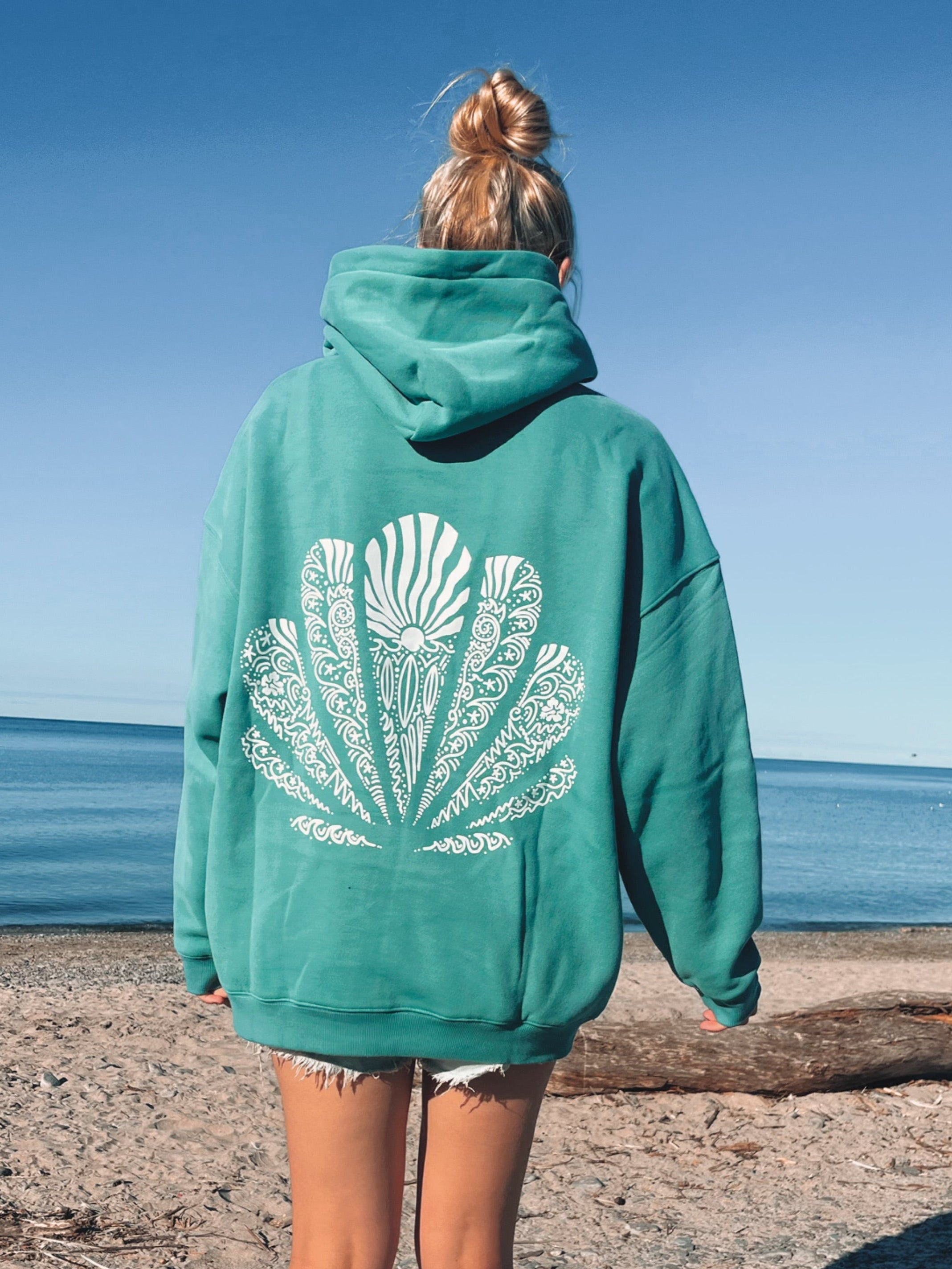 Soft teal, sunkissed shell vibes, and hand-drawn coastal details — this hoodie was made for beach walks, bonfire nights, and daydreams of the sea.
